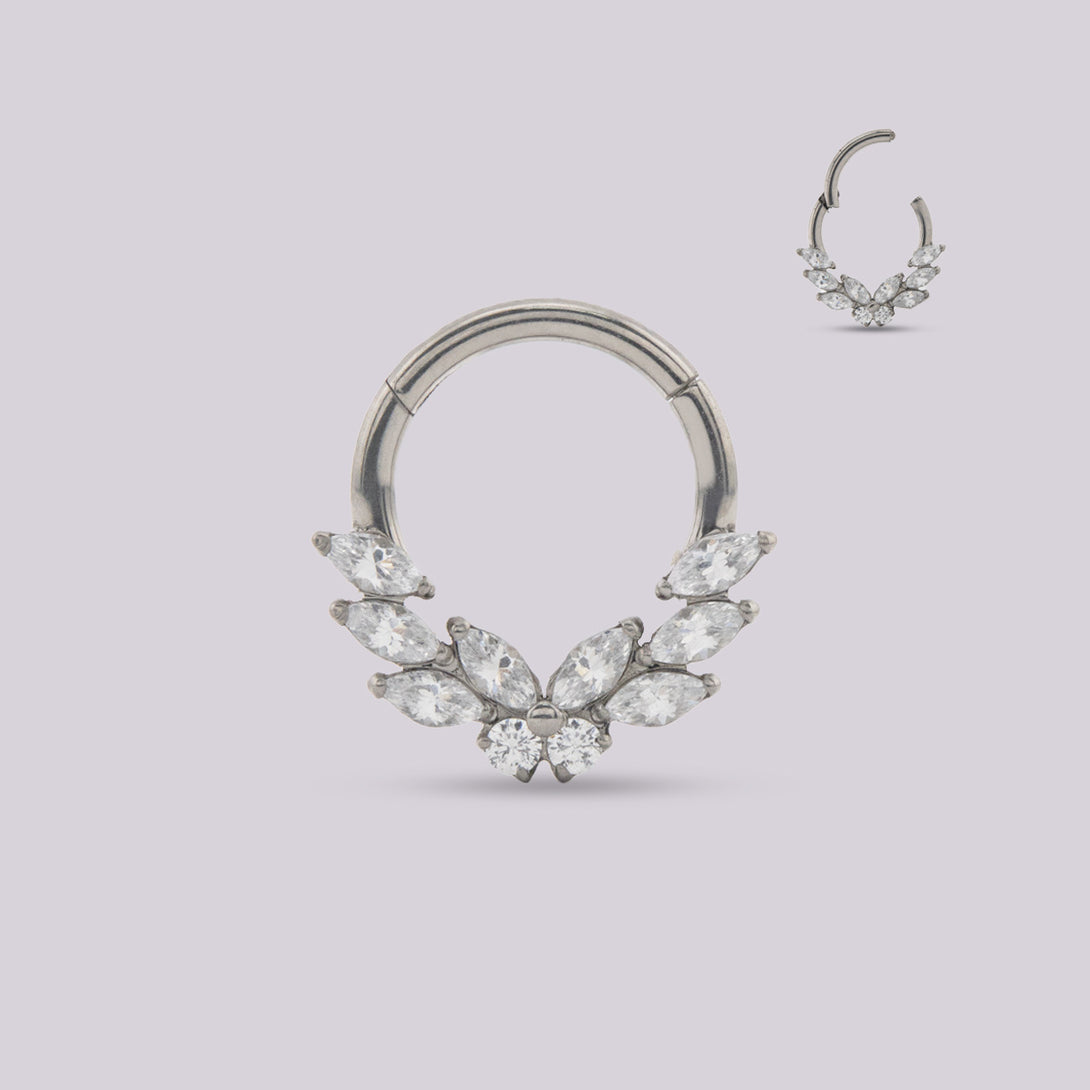 Adorn your piercing with our exquisite Angel Wing Clicker Hoop, crafted from hypoallergenic implant-grade titanium. This stunning piece features an intricate design of clustered cubic zirconia forming delicate wings, adding a touch of celestial elegance to your look. The secure clicker system ensures effortless insertion and a comfortable, reliable fit, making it perfect for your daith or septum piercing.