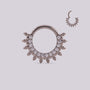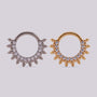 El Aro Sol en titanio grado implante está diseñado para quienes buscan una joya llamativa, segura y cómoda para el uso diario. Su diseño inspirado en el sol, con detalles radiantes y zircones brillantes, aporta carácter y luz al rostro, manteniendo un estilo equilibrado entre lo ornamental y lo funcional.