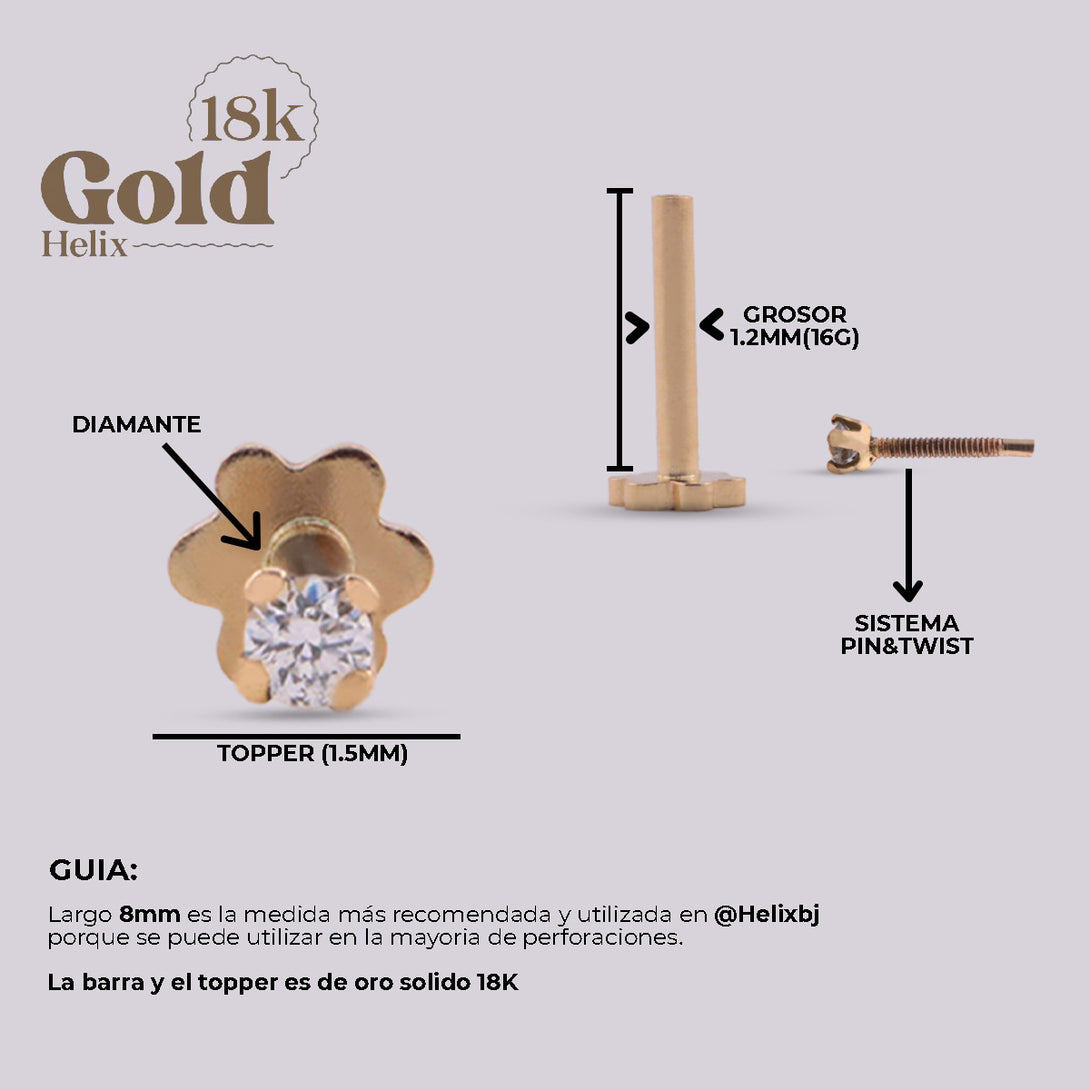 Elevate your Ear Look with this 18K solid gold jewel with a 1.5mm diamond inlay. It is a piece of high jewelry recommended in your collection because you can use it in the vast majority of piercings from basic piercings in the Lobe and upper lobe to more elaborate piercings such as Helix, Tragus, Flat and Contra Helix. In this piece we highlight the internal thread opening system that facilitates the insertion of the jewel, guaranteeing safety in the clasp and practicality in hygiene.