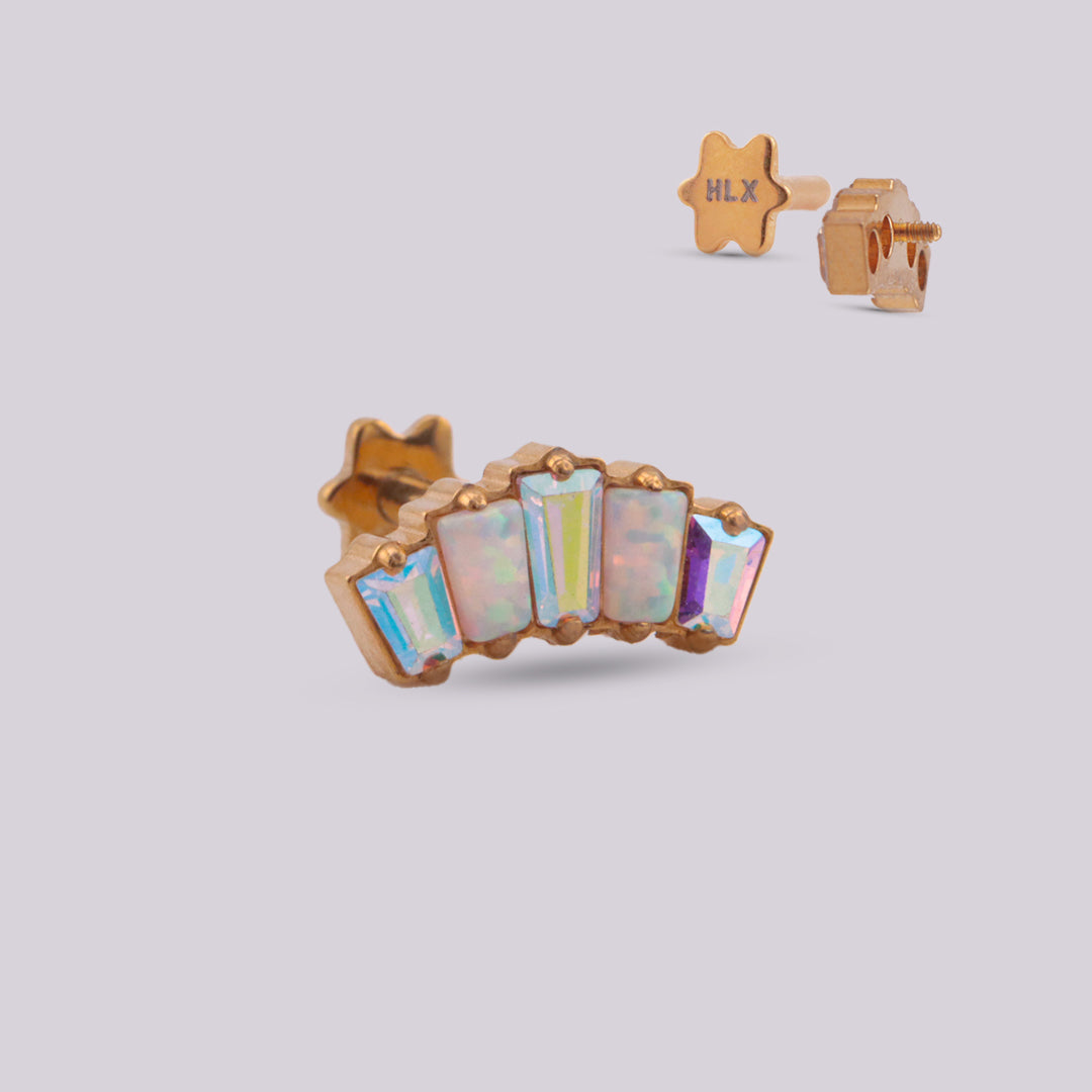 El Labret Dinasty en titanio es una joya para piercing con diseño tipo corona, creada para destacar con elegancia y brillo. Su composición incluye cinco cristales de zirconia con ópalo #17 y zirconia AB, que reflejan la luz de forma intensa y sofisticada. Gracias a su tamaño medio y su estructura ligera, es una pieza cómoda, segura y perfecta para el uso diario.