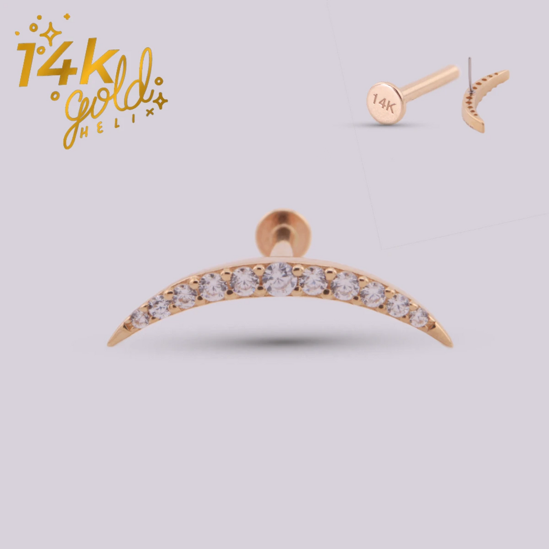 This jewel is made of solid 14K gold with delicate 5A Cubic Zirconia inlays and easy push pin opening system, and due to its delicate curved line shape, it fits perfectly in Helix, Lobe and Upper lobe