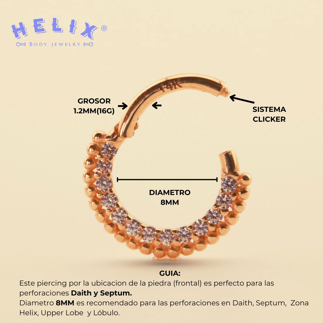 This piercing is synonymous with beauty and elegance because it combines the elegance of gold with grade 5A zircon crystals, with a perfect balance of symmetry. Due to its frontal characteristics, it is recommended for Daith and Septum piercings.