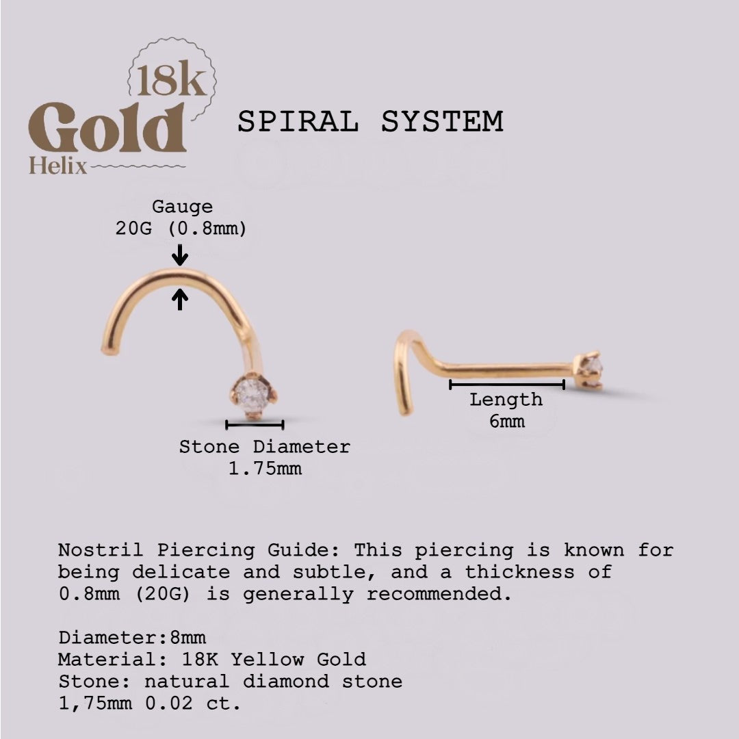 Our nose jewelry is made of solid 18K gold with diamond inlay, high quality materials that ensure durability and timeless shine. This is a delicate and elegant piece, designed to enhance the natural beauty of the face; The spiral system facilitates insertion, providing safety and comfort.