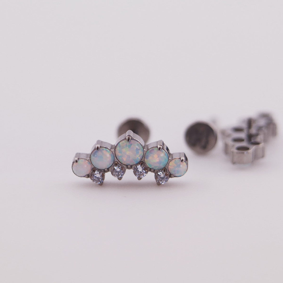 Highlight your style with our Talía titanium piercing jewelry, made of titanium. Composed of three semi-crown-shaped labrets and five opal inlays and silver zircon appliqués, in lilac, pink and iridescent tones. The perfect balance between elegance and bold style.