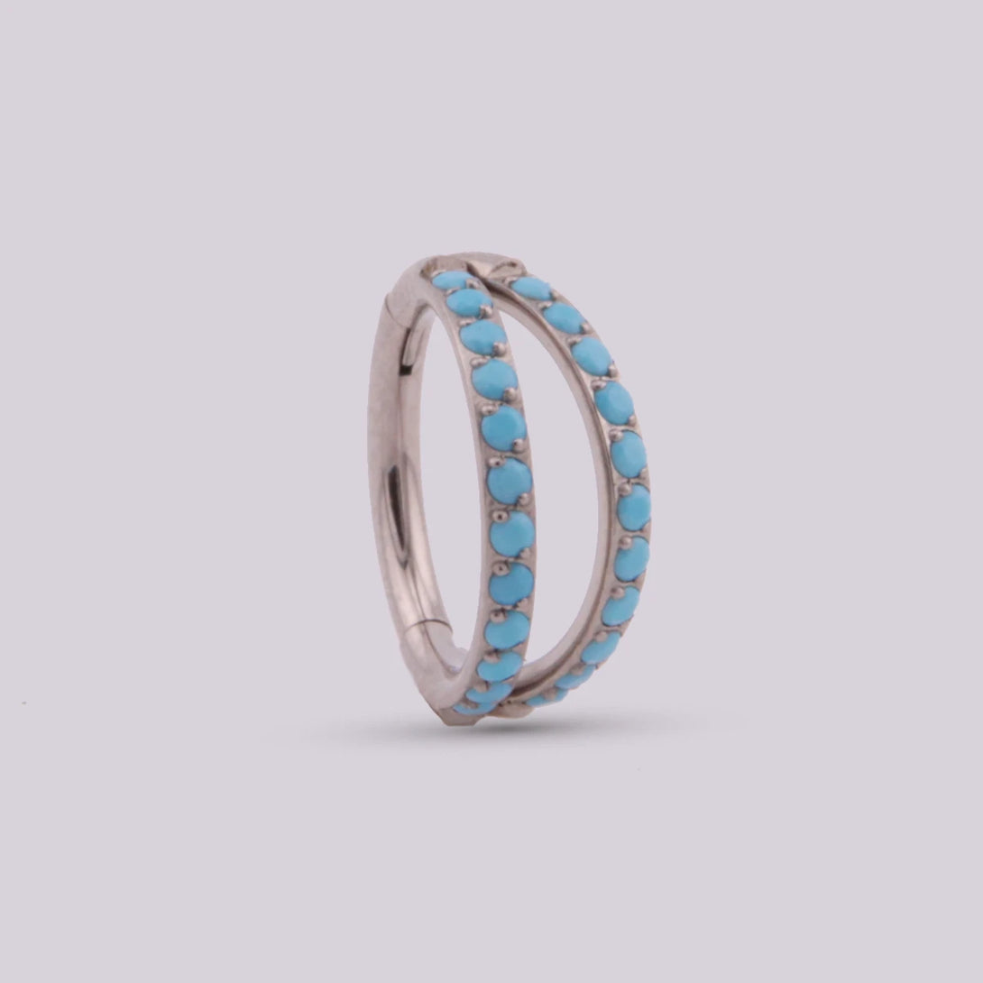 Elevate your style with our beautiful Agate piercing with inlaid opals in turquoise, this jewel is adorned with two brilliant bezels surrounded by small and delicate opals. This sophisticated and modern design is perfect for your Lobe, Helix, Conch and Upper Lobe piercings. The turquoise hue reflects elegance and is a quite different option from classic colors such as gold and silver.