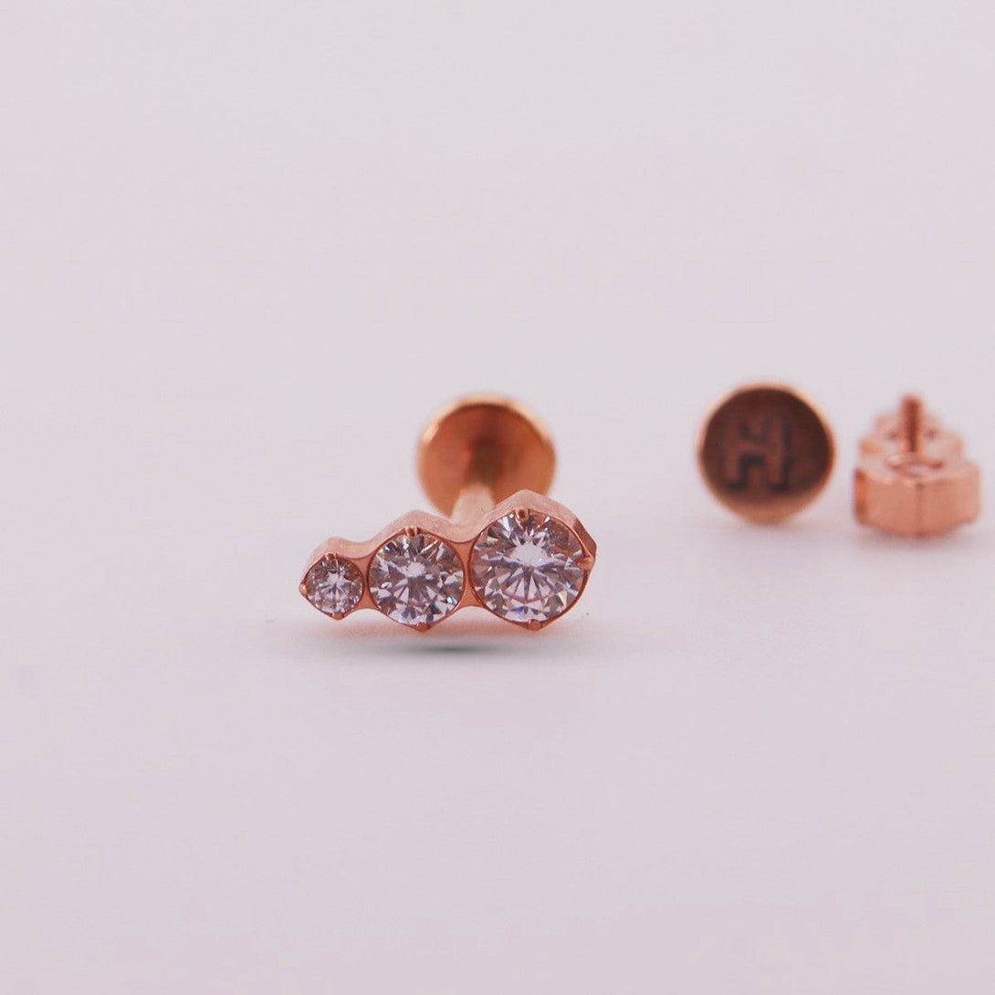 This piercing is made up of three zircons that decrease in size creating a waterfall effect. It is available in gold, silver and rose gold tones and being made of titanium, it is a light, hypoallergenic jewel that you can use for initial piercing or as a daily wear jewel. You can use them in most piercings such as Helix, Tragus, Forward Helix, Conch, Lobe and Upper Lobe