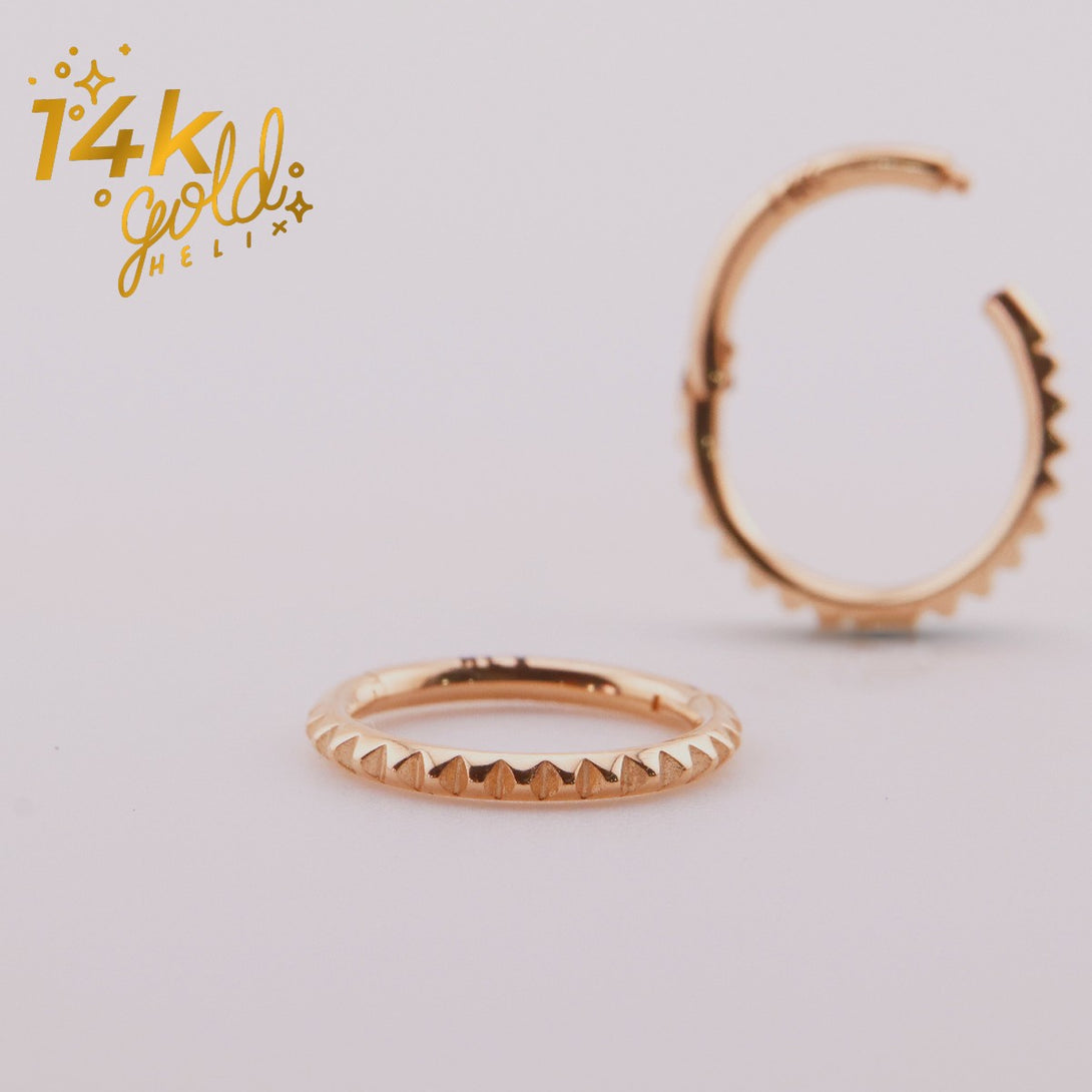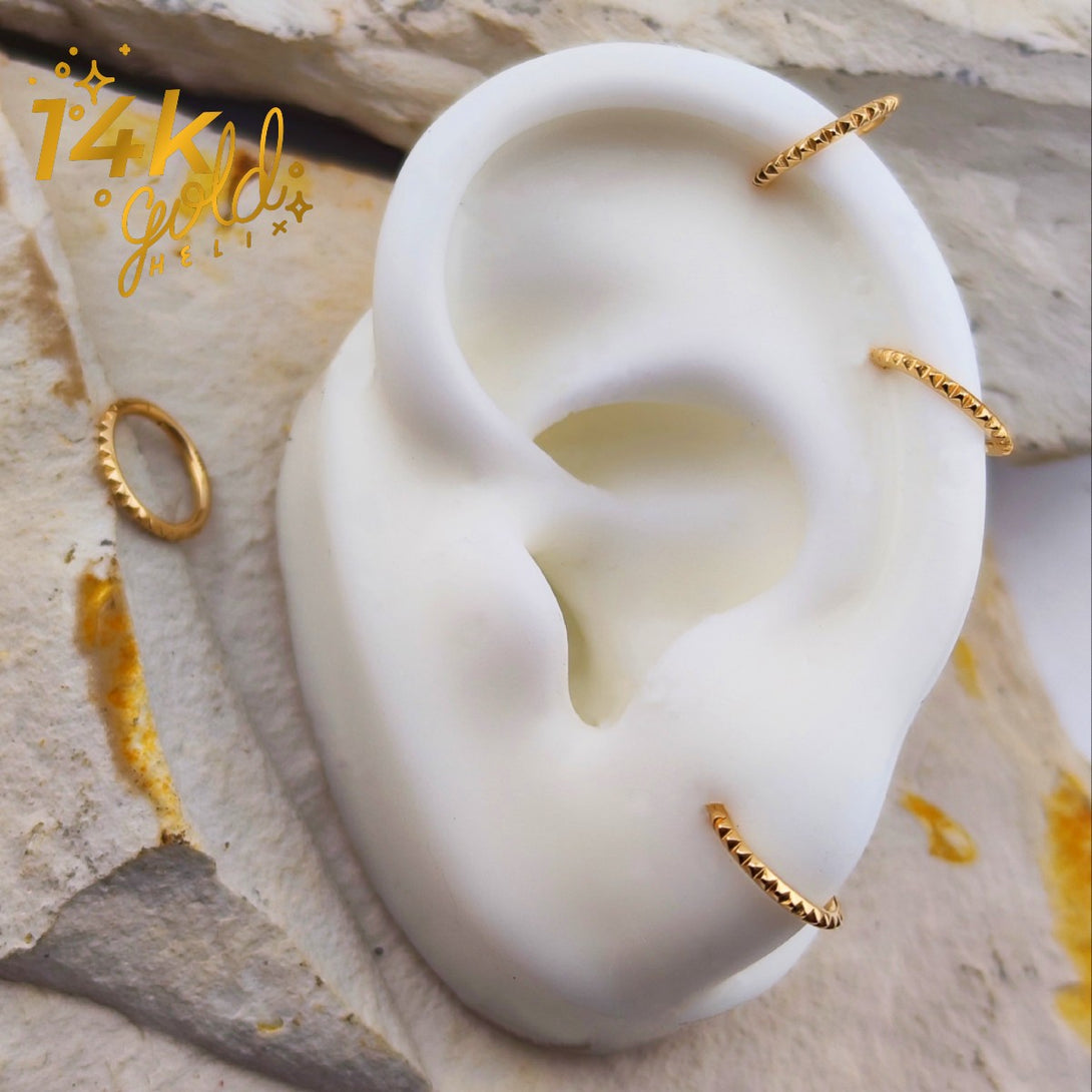 This hoop is characterized by its beveled reliefs that reflect the majestic shine that gold emits. It is a jewel that you can use in piercings such as the Helix, Lobe, Upper Lobe and will give you an elegant and classic style but that you can combine with other types of earrings. piercing to elevate your Ear Look
