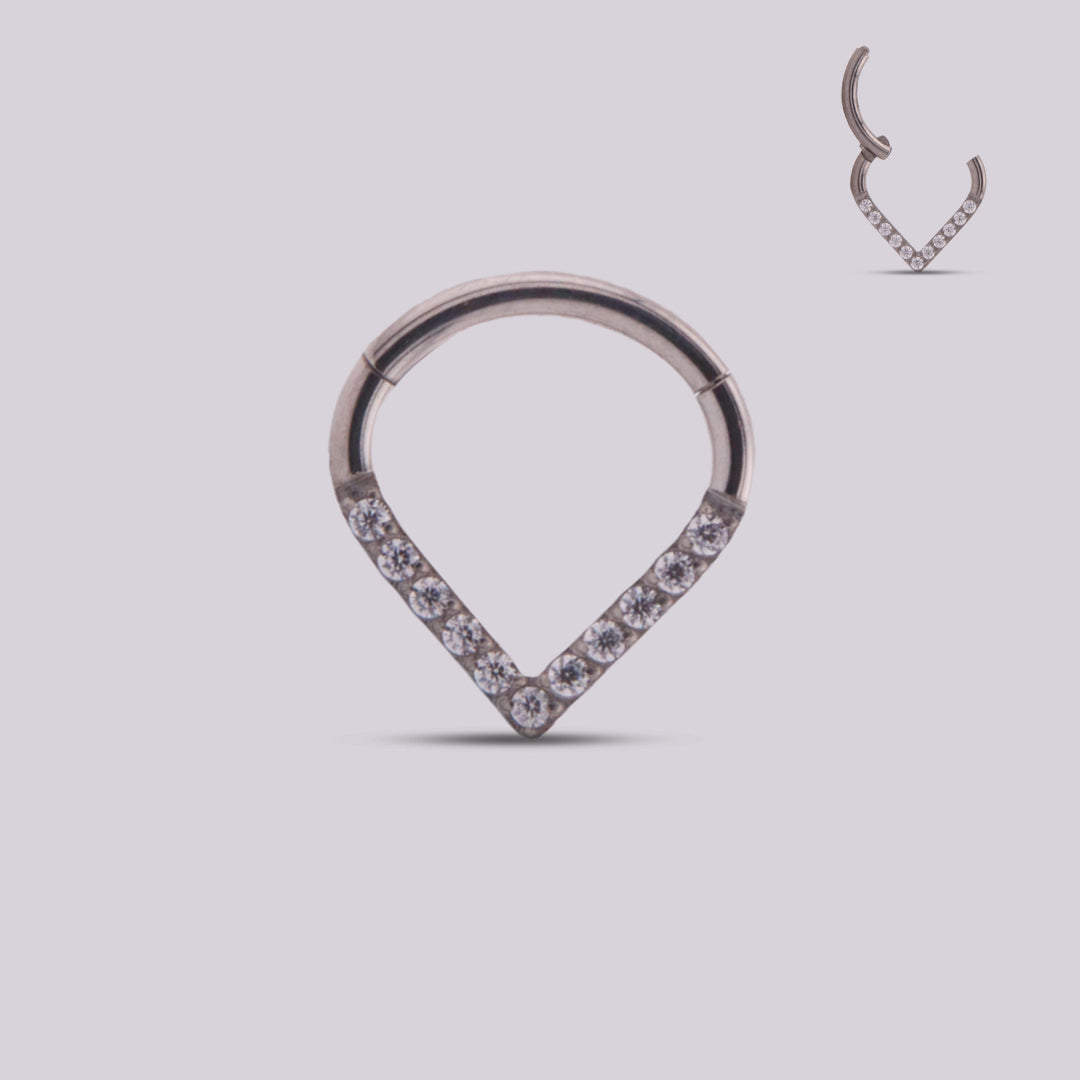 This piercing is a delicate and beautiful jewel due to the shine reflected by the zircon inlays, as it is made of titanium it is a jewel for daily use and due to its clicker system it is easy to manipulate and finally it is an innovative design in the shape of an ideal triangle for use in Daith and Septum piercings
